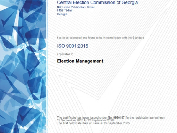 ცენტრალურმა საარჩევნო კომისიამ (ცესკო) არჩევნების მართვის სფეროში საერთაშორისო აუდიტი კვლავ წარმატებით გაიარა. ხარისხის მართვის საერთაშორისო სტანდარტის ISO 9001:2015-ის ფარგლებში ჩატარებული აუდიტი ორ ეტაპად განხორციელდა.