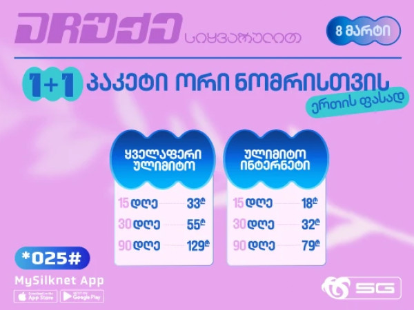 მხოლოდ 8 მარტს, საგაზაფხულო შეთავაზების ფარგლებში, სილქნეტის მომხმარებელს შესაძლებლობა აქვს ნებისმიერ ნომერს ჩაურთოს სასურველი ულიმიტო პაკეტი და საჩუქრად მიიღოს იგივე პირობა საკუთარ ნომერზე: